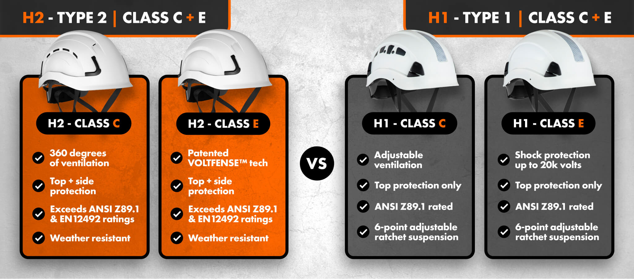 - The Defender Safety H2 helmet exceeds OSHA standards, ANSI Z89.1 Type II for side and top impact protection, and EN12492 certifications (Clause 4.2.1, 4.2.2, and 4.1.4) for fall protection and debris resistance.