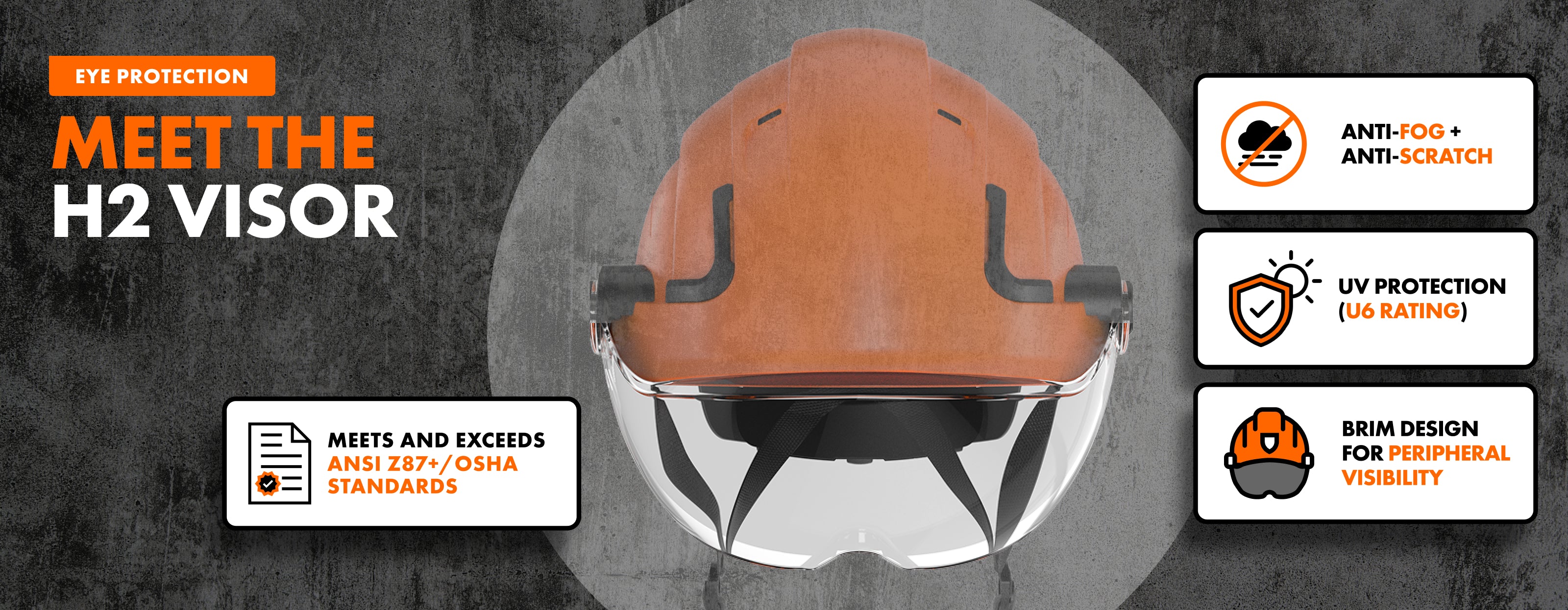 The H2 visor is made from polycarbonate, which is the same material used in riot shields and bulletproof glass. It’s lightweight enough that workers won’t feel it during long shifts, but impact-resistant enough to meet ANSI Z87+ certification. For jobsite conditions, drops, debris, daily handling, polycarbonate is the right material.