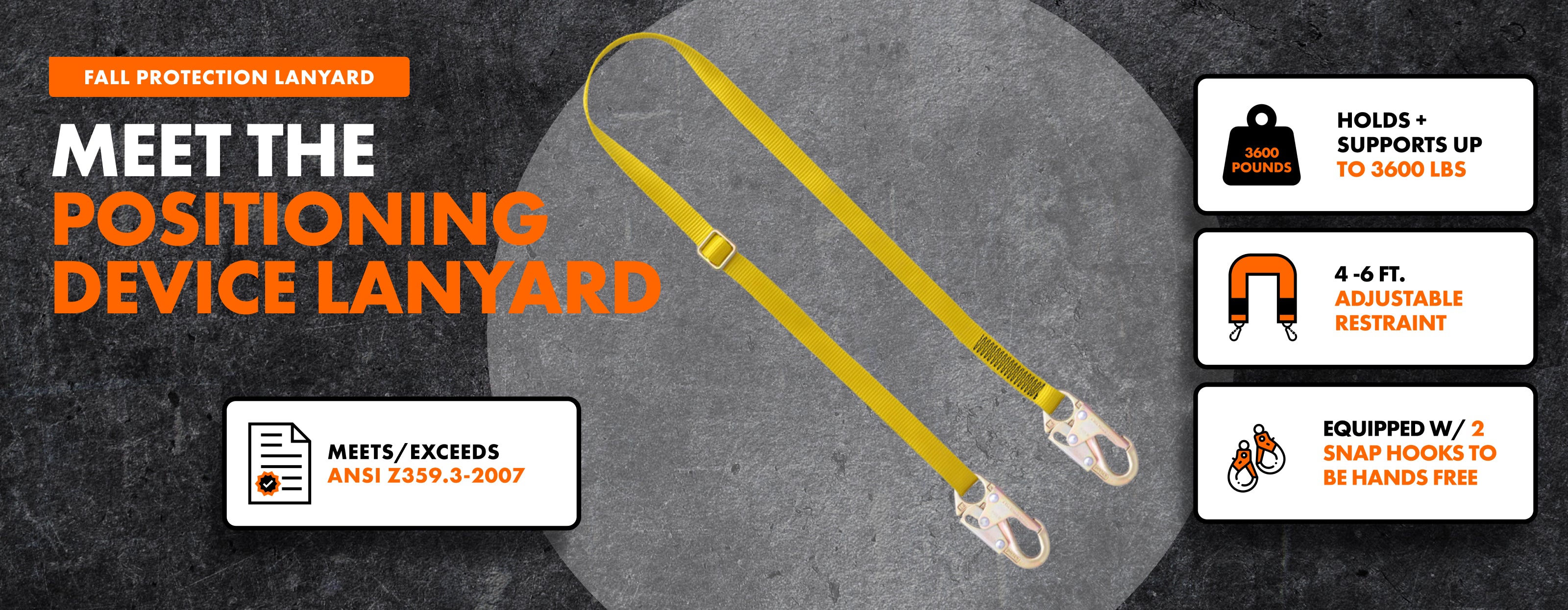 The positioning device lanyard is built to keep workers securely in place while performing tasks at height. With an adjustable 4–6 ft range and dual snap hook design, it allows for precise positioning and hands-free work. Constructed with high-strength webbing and compliant with ANSI standards, it’s ideal for applications where stability and control are critical—but should be used alongside a fall arrest system when fall hazards are present.